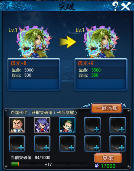 英雄可以通过吞食多余的卡牌来实现突破,突破到一定程度后可以觉醒,属性会得到极大的提升,同时,卡牌的外观也会发生巨大的变化。