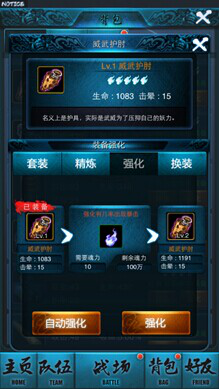 《幽游魔强传》装备系统同样秉承了英雄系统中的星级原则,不同的是,装备具有6个星级的区别。高星级的装备将给玩家带来巨大的战斗力提升。点击主界面下方的“背包”选项,即可选择进入装备列表。