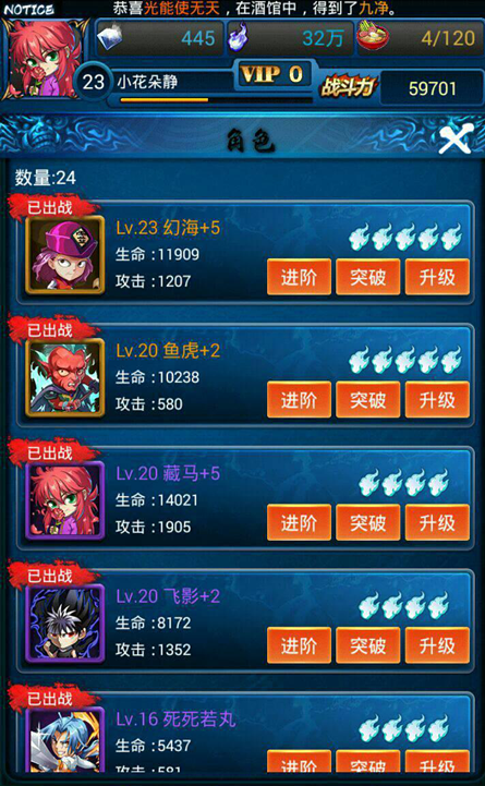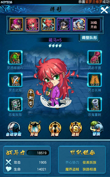 阵容:幻海(2)藏马(3)飞影(2)幽助(3)鱼虎(2)妖馱(2)前期装备:全蓝色输出套攻200 10%攻 暴10 打架或者过图很强力 首饰恶鬼套。后期可换紫色输出套或生命套 也可以选择继续把蓝色全部完美,看个人喜好了。首饰可以给幻海 藏马 飞影换成吸血套8闪避10吸血。