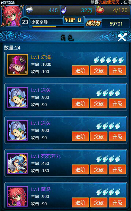进去游戏,首先淘下礼包,不强求一定淘到,看颜值,有淘到1-3个礼包最好,可以前期多100-500魔晶。然后就是首选角色,个人喜欢藏马,原因是过图快。除了桑原,幽助和飞影也可以选,幽助可以和第二天系统送的幻海组合缘分。