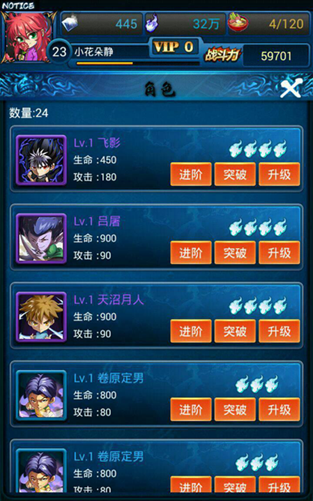 这时候,魔晶应该轻松突破2800了,别手软,果断十连,如果紫卡有3小强,或者橙卡是妖馱或者鱼虎,好了,继续升级去吧。(如果不是建议重新注册号再来吧,一次也就耽误10几分钟,因为系统送的魔晶第一天也就4次十连,所以第一次抽卡运气很重要。)15级的时候可以去竞技场,这时候要把装备和卡牌升级一下,最好两个强力卡牌去魔晶商店刷两套恶鬼首饰命2000攻击100的那个,保证近3w的战力轻松进前100。记得去把声望商店里的魔晶兑换了。这时候可以抽取十连两次了。如果运气好出了藏马幽助组合或者有妖太和鱼虎其一,可以考虑充值了,我是充的V4。(如果3次十连没有接近上面的组合,重来吧,这时候也就半个小时左右,不会影响级别太多)。
